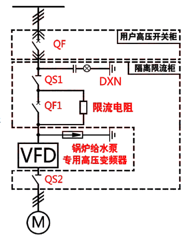 此方案為一拖一的典型方案,QS1、QS2為隔離開(kāi)關(guān)。系統高壓上電時(shí),電流首先通過(guò)限流電阻對系統進(jìn)行充電,當系統充電完畢后斷路器QF1自動(dòng)動(dòng)作,切除限流電阻,系統正常上電,整個(gè)高壓上電過(guò)程對系統無(wú)沖擊,有效的提高了設備使用的穩定性及設備的使用壽命。