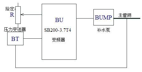 為更進(jìn)一步的節能,對換熱站實(shí)施了自動(dòng)化改造,循環(huán)泵和補水泵用變頻調節,整個(gè)城市供熱系統用計算機進(jìn)行監控,實(shí)現了換熱站無(wú)人值守。通過(guò)循環(huán)泵使熱水在供熱系統中運行,管道、閥門(mén)的泄漏引起循環(huán)水的水壓降低,如不及時(shí)補水,會(huì )造成供熱系統運行不正常。補水泵的變頻泵補水方式比較簡(jiǎn)單,采用恒壓供水方式,設定壓力為4kg。本例選用一臺SB200-3.7T4變頻器,選用森納斯DG130W-BZ-A 1MPa壓力變送器,變頻調速補水系統如圖所示: